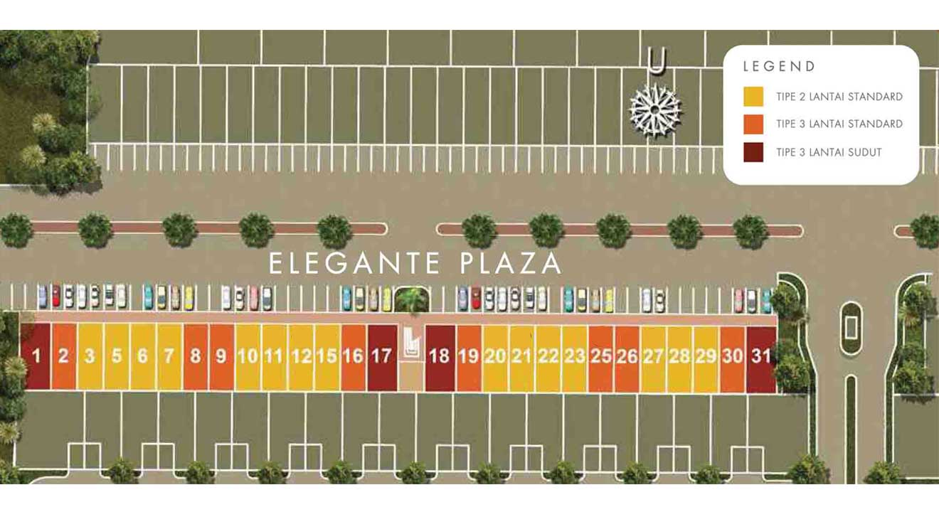 Tampak depan ruko Elegante Plaza di CitraLand Cirebon. Bangunan komersial modern dengan dua dan tiga lantai, area makan di luar ruangan, dan keramaian pengunjung, menunjukkan suasana bisnis yang hidup.